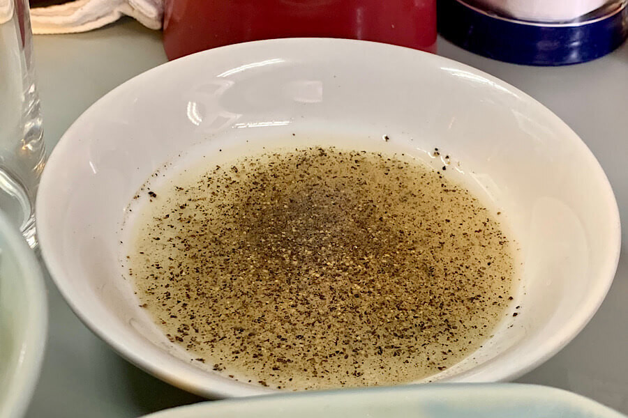 店員の方が「タレ作りましょうか?」と声をかけてきたのでお願いしたら、この店発祥という酢コショウのタレを小皿に作ってくれました。思ったよりもコショウをドバドバ入れます。