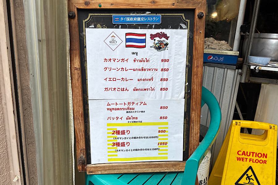 上3つカオマンガイ、グリーンカレー、ガパオごはんは定番メニューで、下3つが日替わりメニューです。
