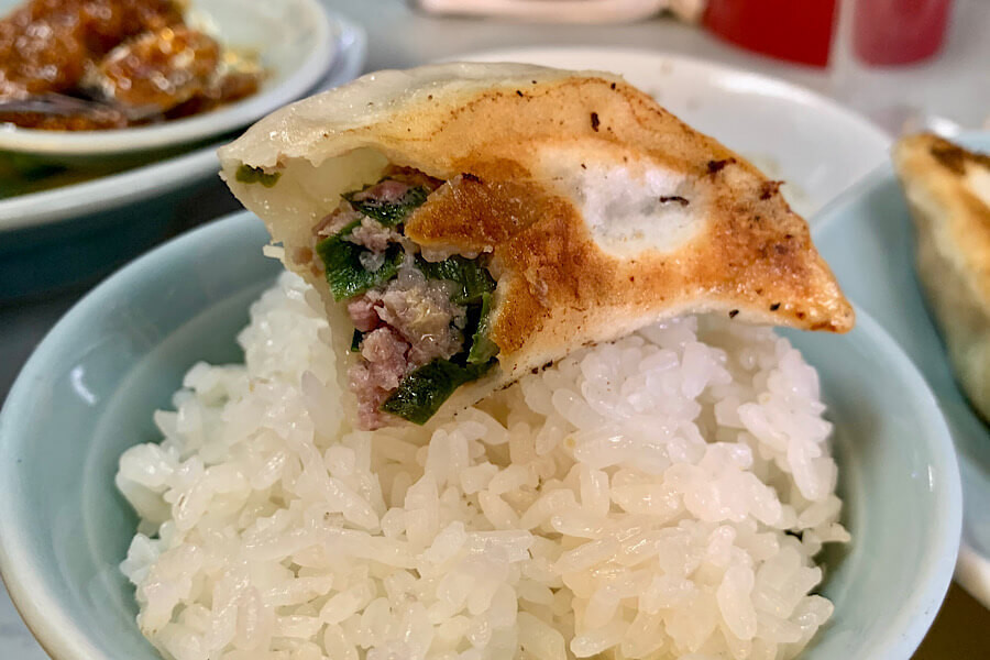 皮がもちもちしていて、餃子の餡は肉が多くて肉汁が垂れてきます。ご飯の上にあわてて乗せると肉汁でご飯がつやつやになりました。