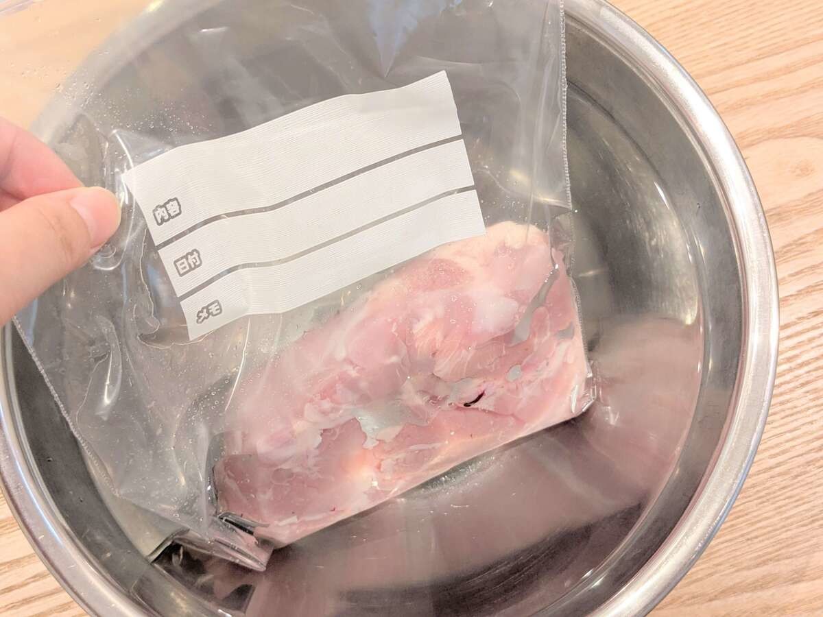 ジッパーバッグに食材を入れ、少しずつ下から水に沈めていきます。