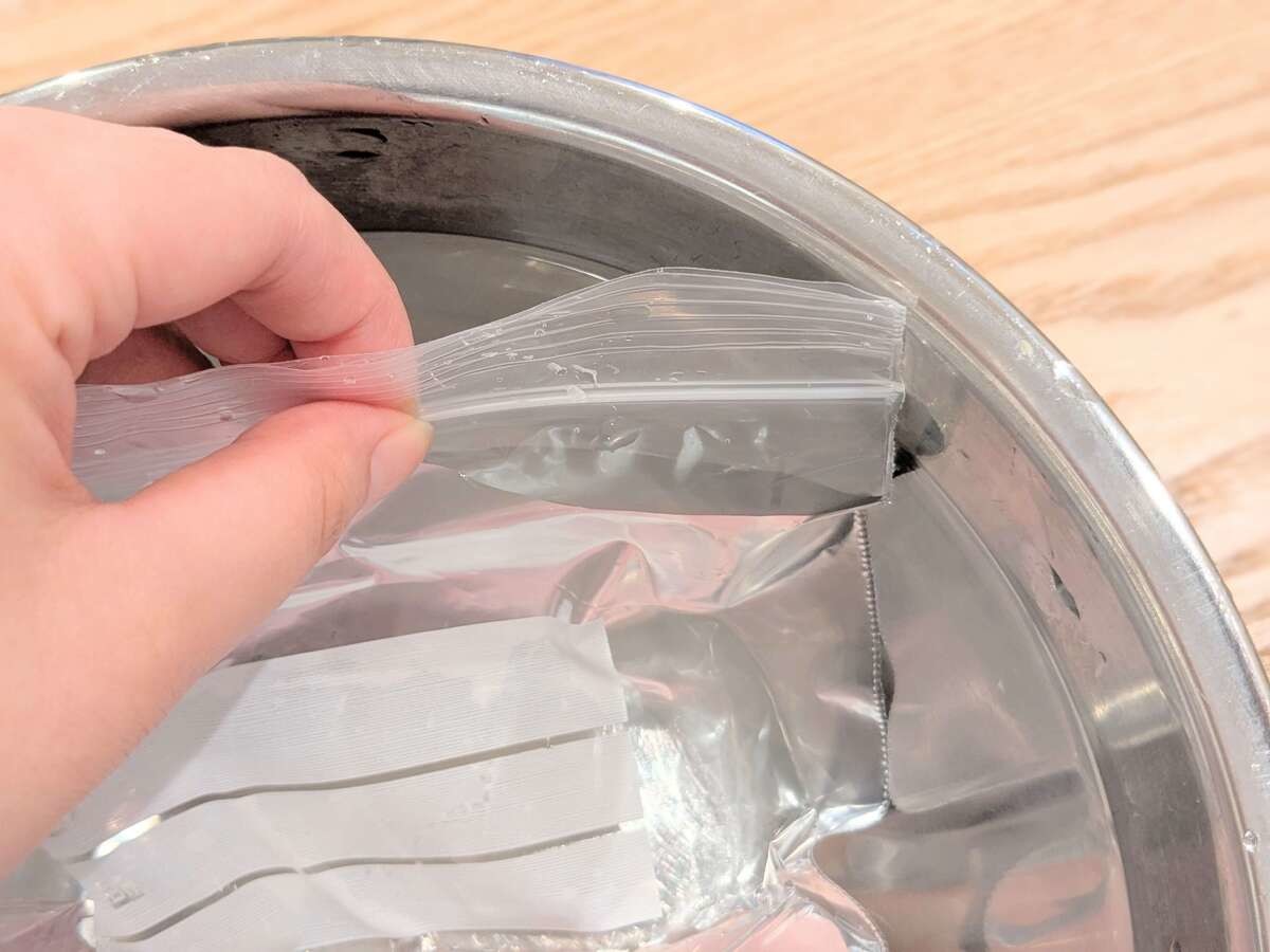 開け口ギリギリまでジッパーバッグを水に沈めます。