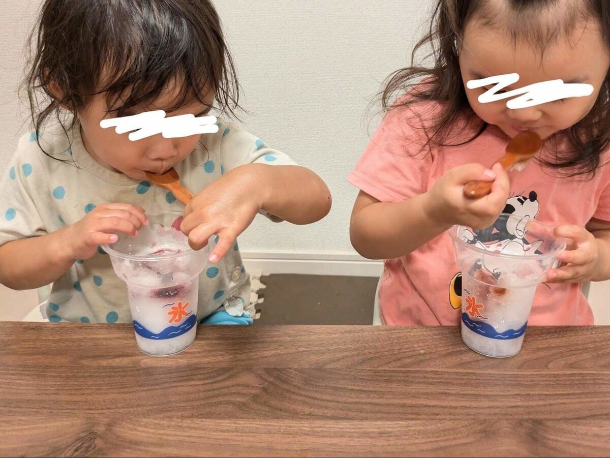 今回は2歳と3歳の子どもたちが食べるので、かき氷がこぼれないよう山盛りまで氷を盛らず、カップのフチと同じくらいにしました。