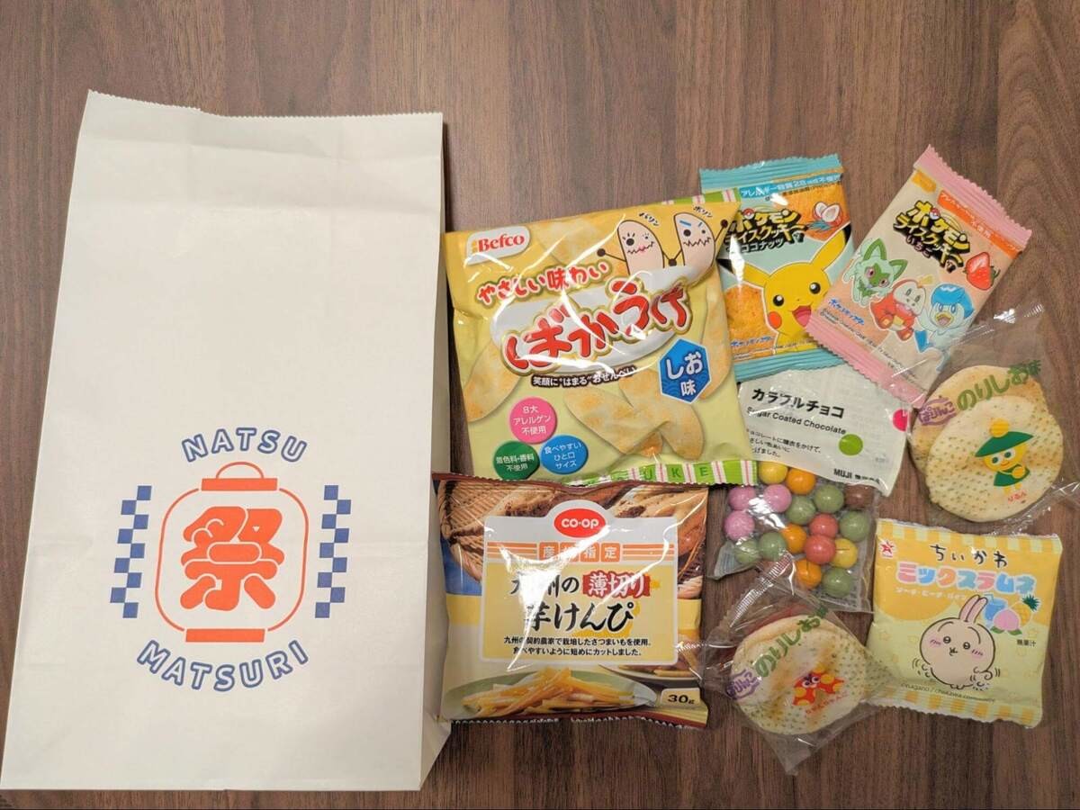 今回は遊びに来てくれた子どもたちへ参加賞として手渡したかったので、お菓子を多数詰めてみました。たっぷりとしたマチがあるので、これだけの量が余裕で入ります。