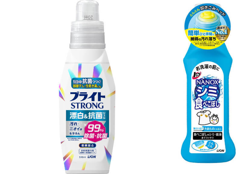 ▲シミ・ニオイを徹底除去「ブライトSTRONG 漂白&抗菌ジェル」/食べこぼしなどのシミ汚れに「トップ NANOX シミ用」