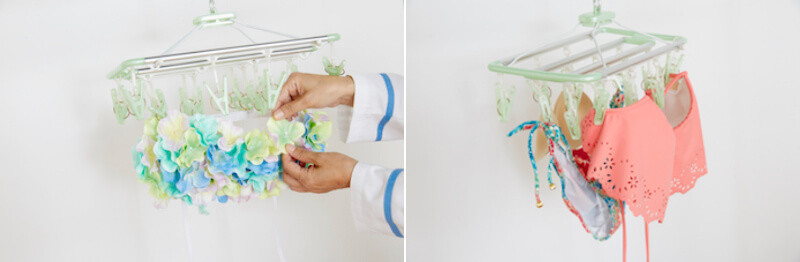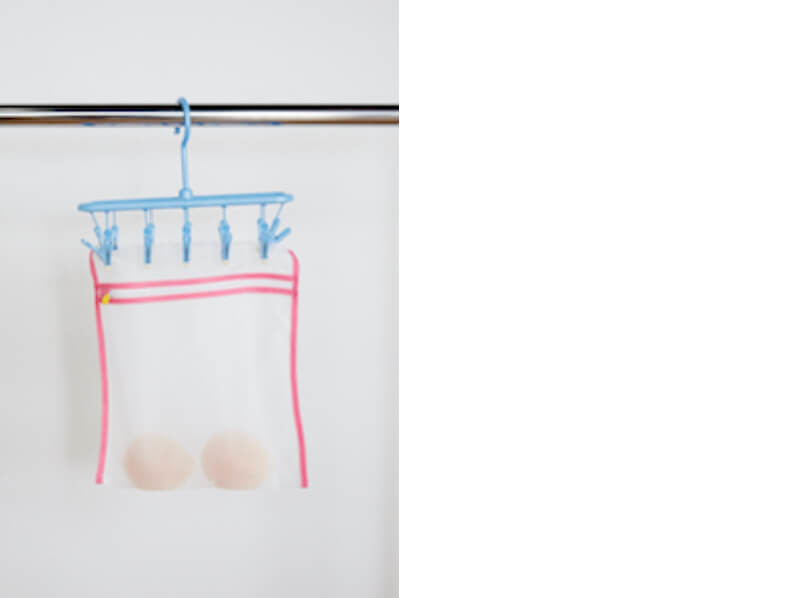 その後、色あせを防ぐために、陰干しにします。肩ひもをつまんで干すとのびやすいので、脇やアンダーバスト部分をはさんで干しましょう。