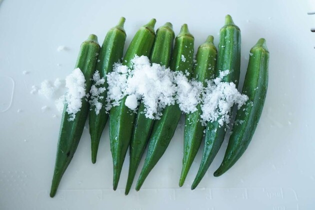 オクラをさっと洗い、まな板の上に並べ、塩を全体にふりかけ手のひらで転がすようにまな板に擦りつけます。