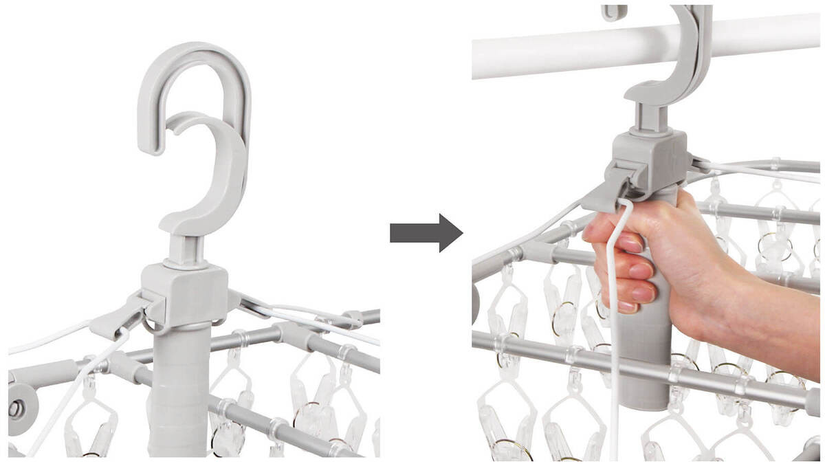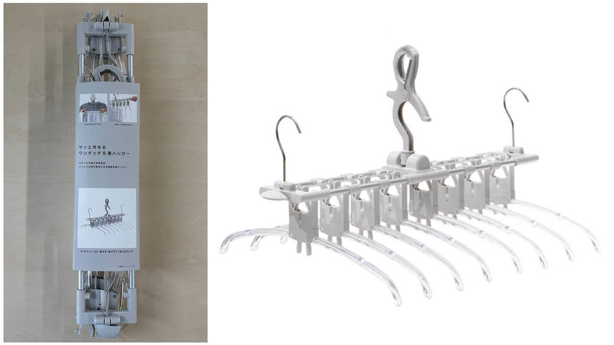 こちらは左右4連ずつのブロック構造になっていて、つまみを回すだけで最大4枚の衣類を一気に取り込めるという便利ハンガー!
