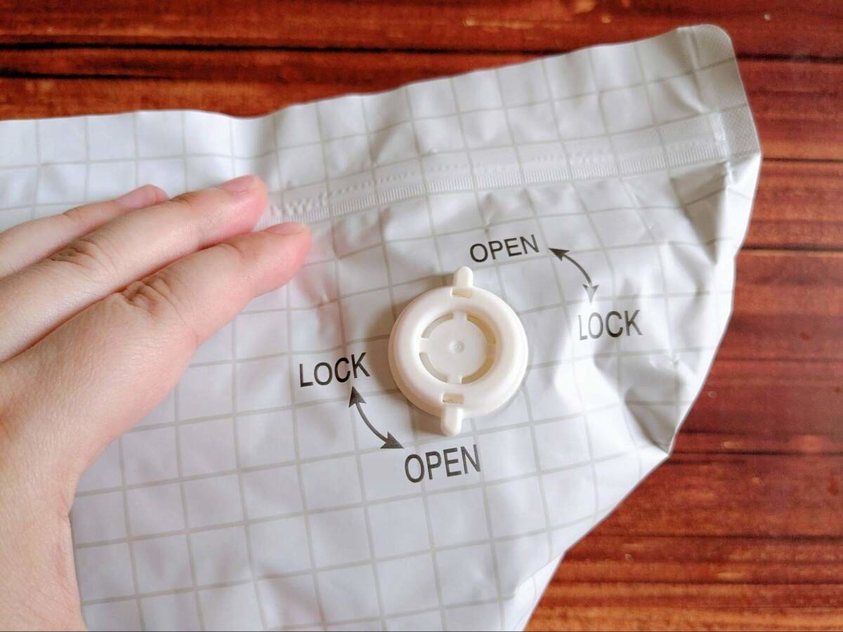 突起をOPENに合わせて空気が抜ける状態にし、中の空気を押し出したら、LOCKに合わせて空気が入らない状態に。