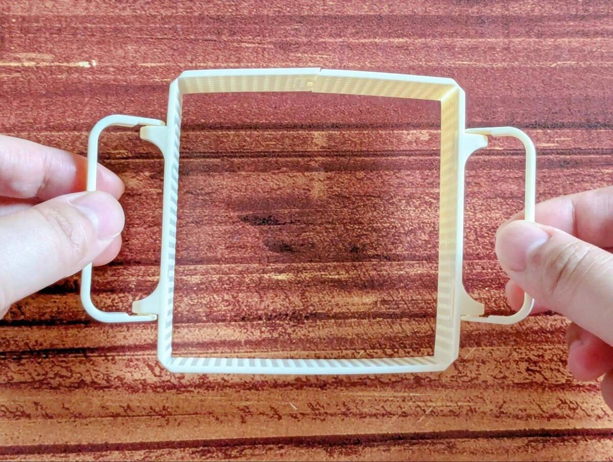 長細い形をしていて、横に付いている取っ手を持って広げると正方形になります。