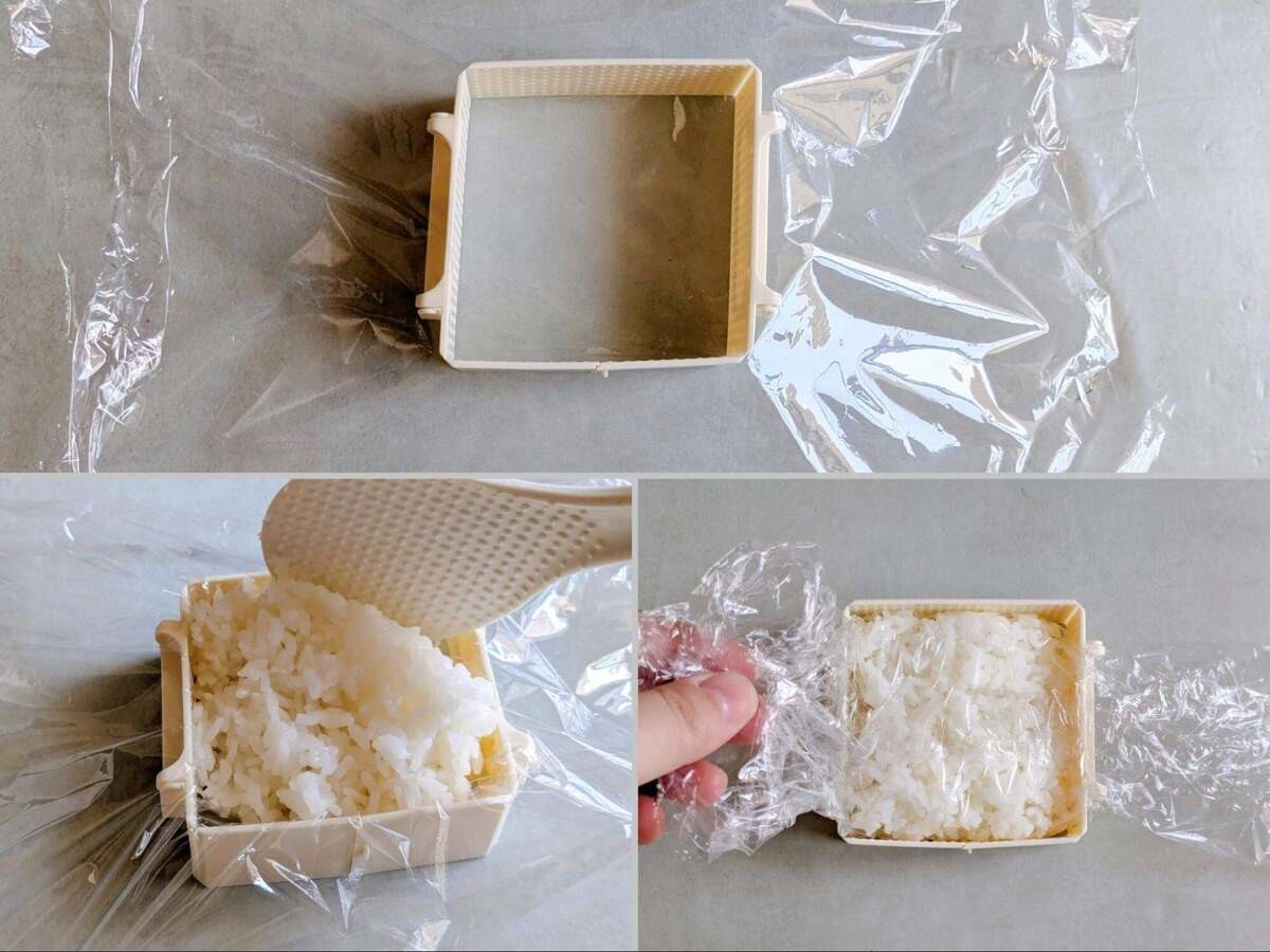 使い方は簡単。このアイテムを広げた上に①ラップを敷いて②ご飯をつめて③包むだけなんです。