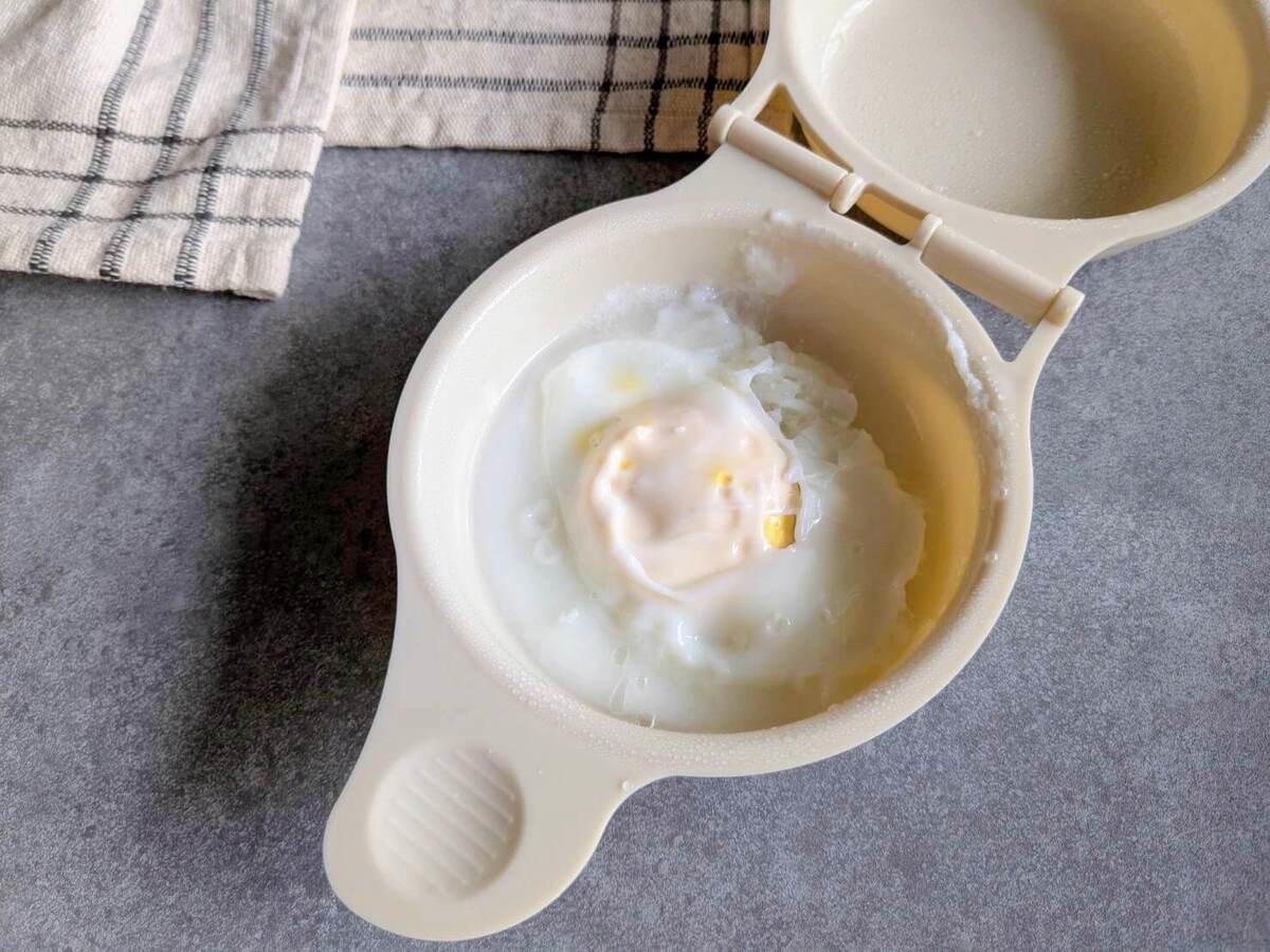 油ではなく水を使っているので、さっぱりした味わいと、ぷるっぷるの食感が良い!フライパンで焼くより好みの目玉焼きが出来上がりました。