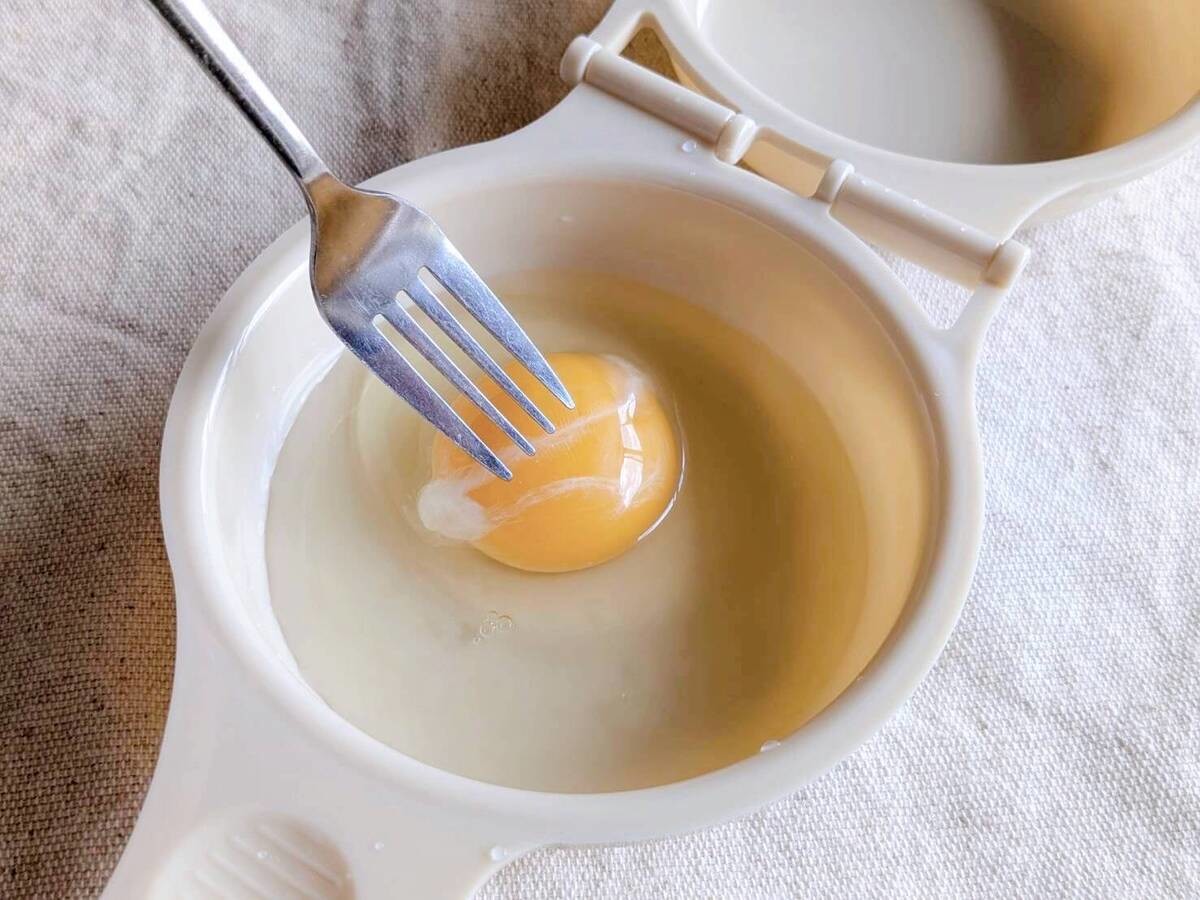 本品に水小さじ1を入れ、内側を濡らしたらたまごを割り入れます。破裂を防ぐため、お箸やフォークで黄身に数カ所穴を開けましょう。