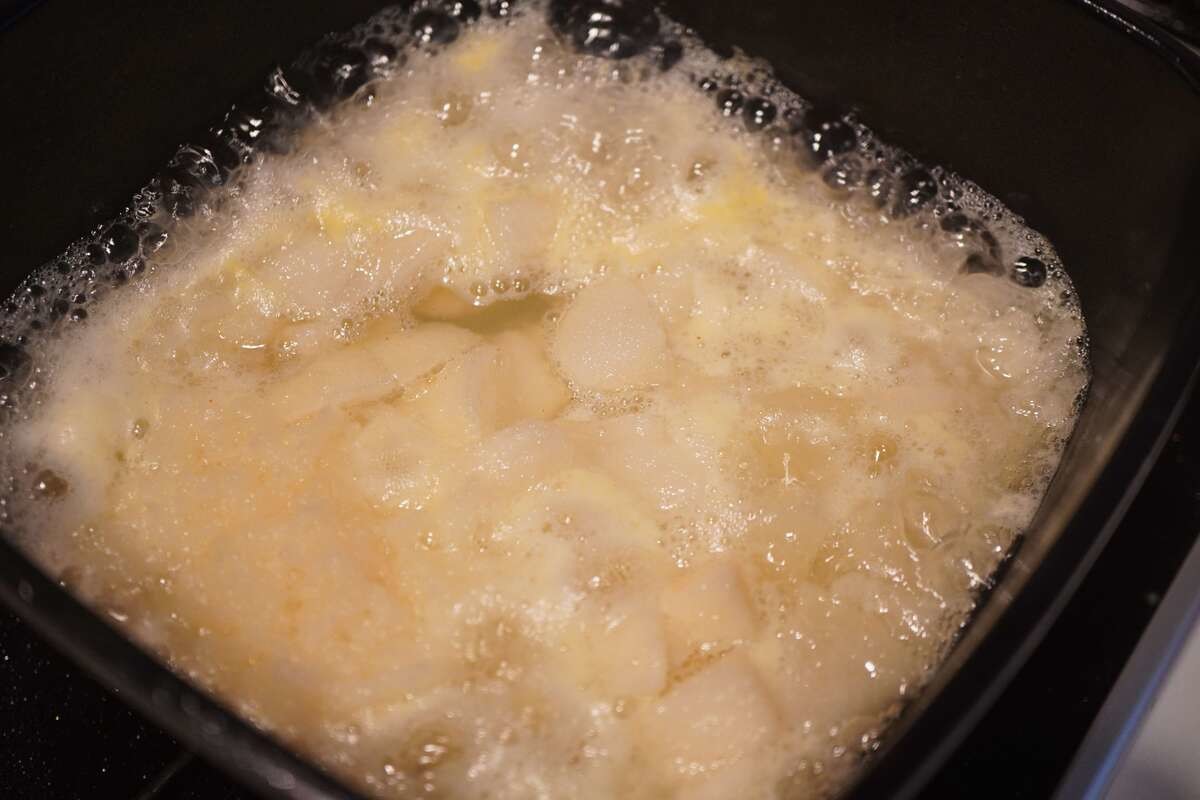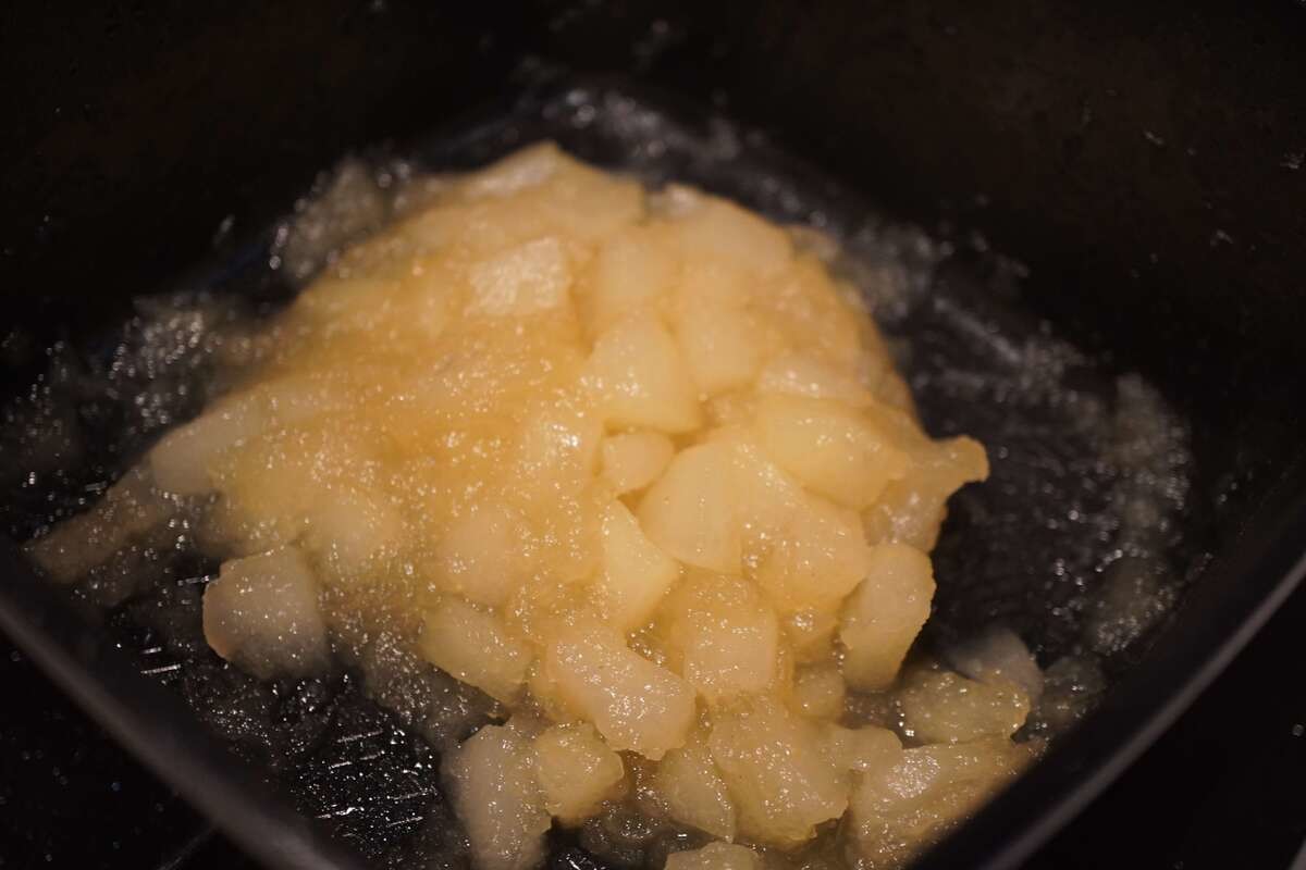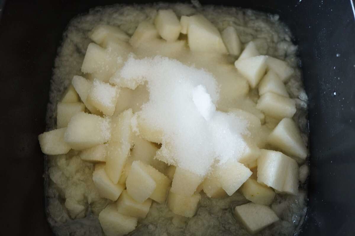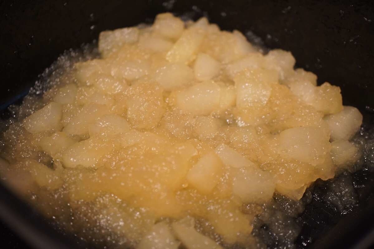 すりおろした梨、角切りにした梨、レモン果汁、グラニュー糖の順に鍋に入れ、強火で煮詰めます。