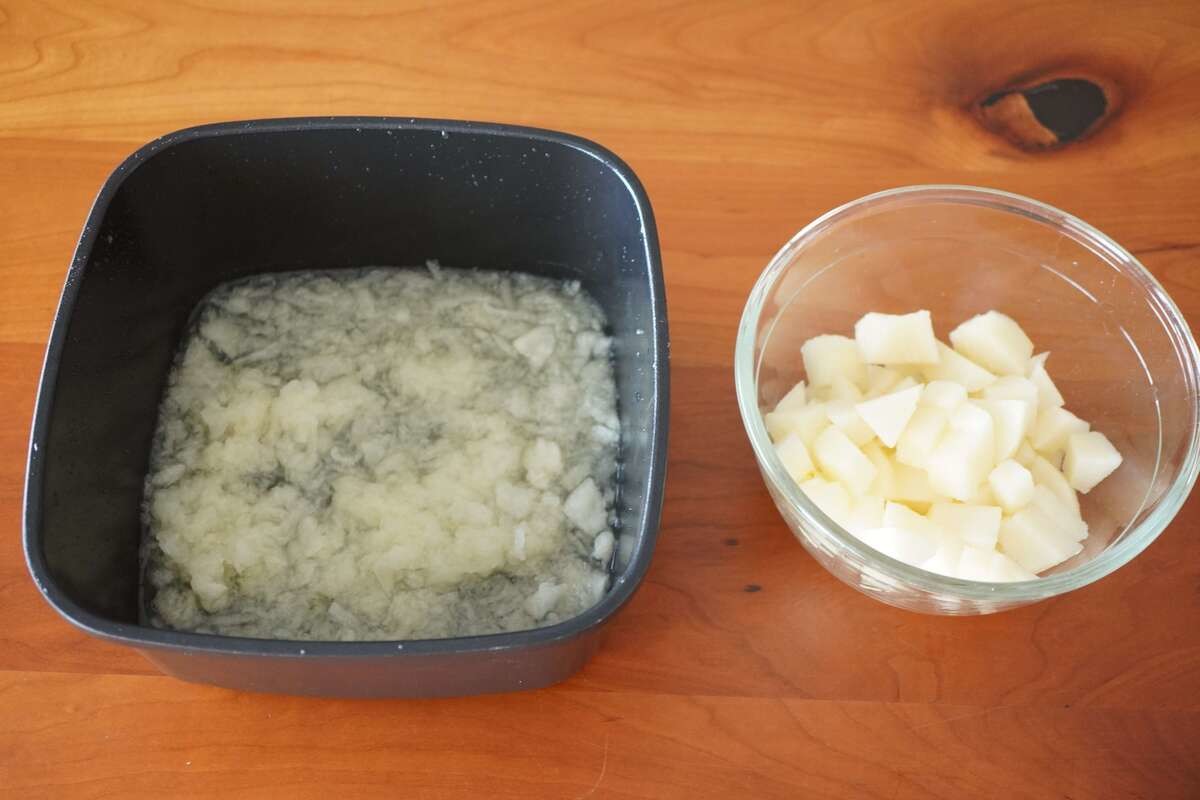 1個はすりおろしに、1個は2cmほどの大きさの角切りにします。