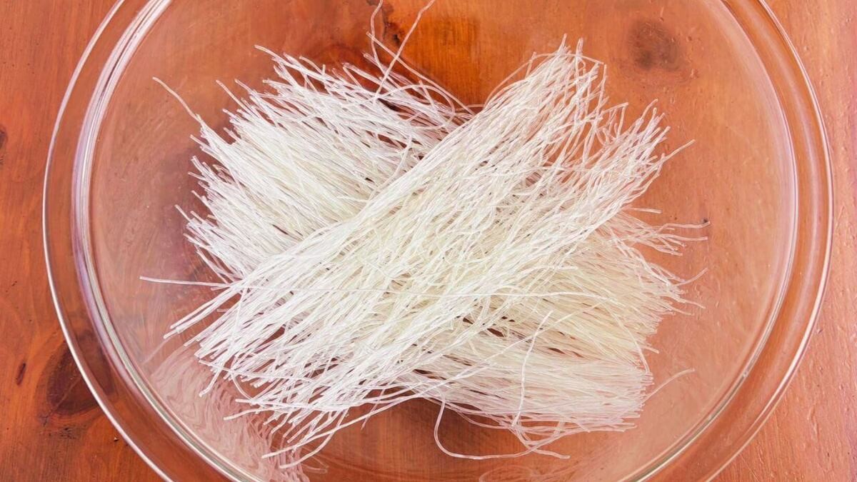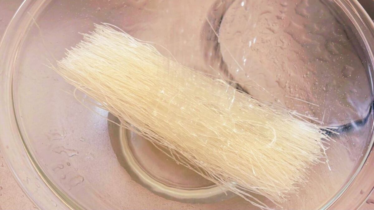 乾燥はるさめを水にくぐらせてから、軽く水気を切ります。