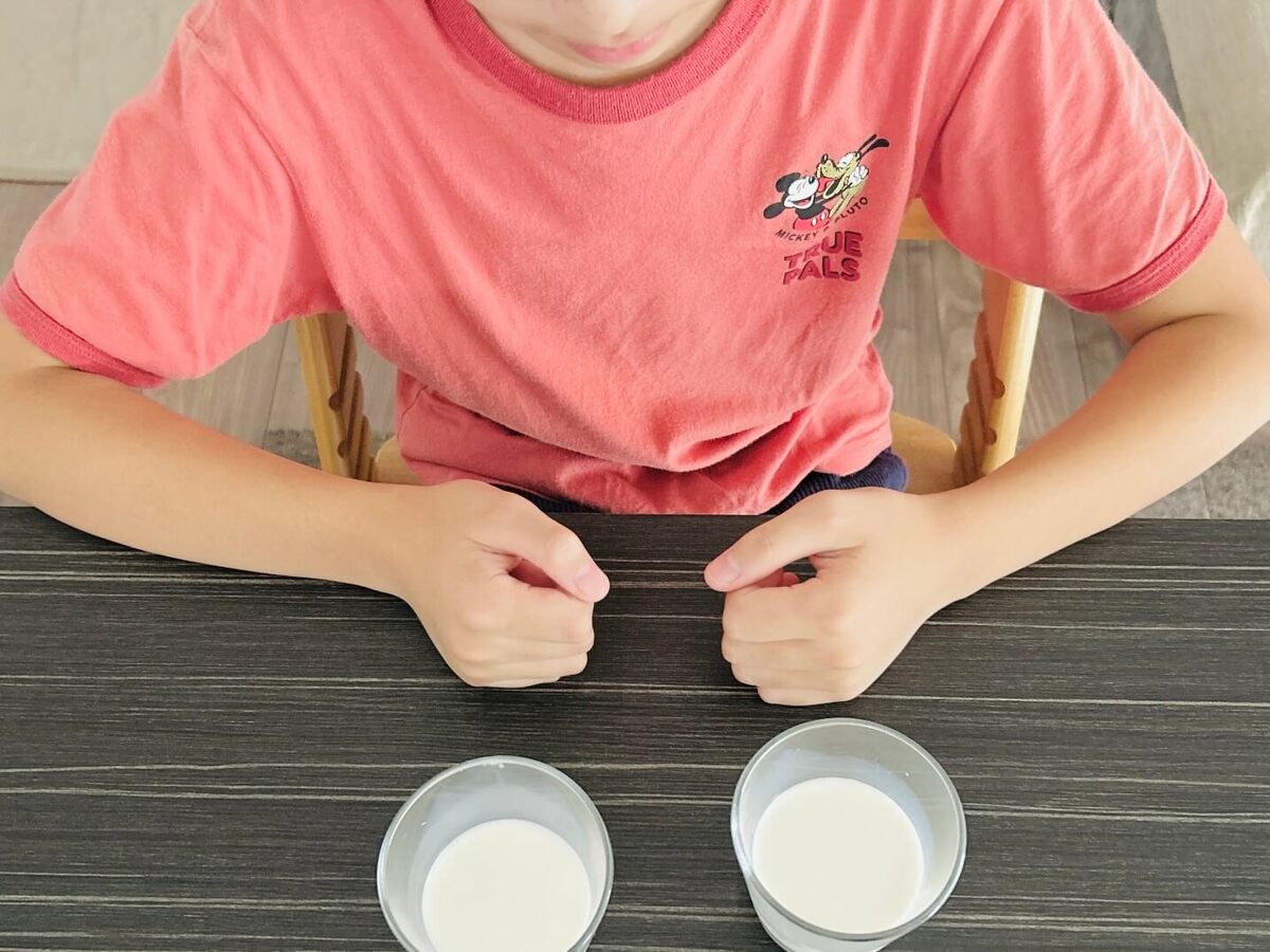 というわけで、いつもの要冷蔵牛乳とロングライフ牛乳をどちらも冷えた状態で準備して、息子に飲み比べてもらうことにしました。