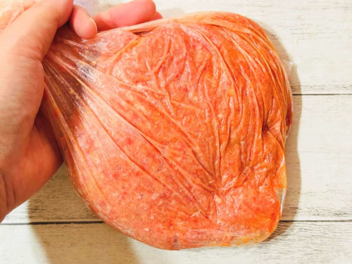 清潔なポリ袋に合いびき肉、卵、パン粉、牛乳、顆粒コンソメスープの素、塩、こしょうを入れ、全体がなじむまでもみます。