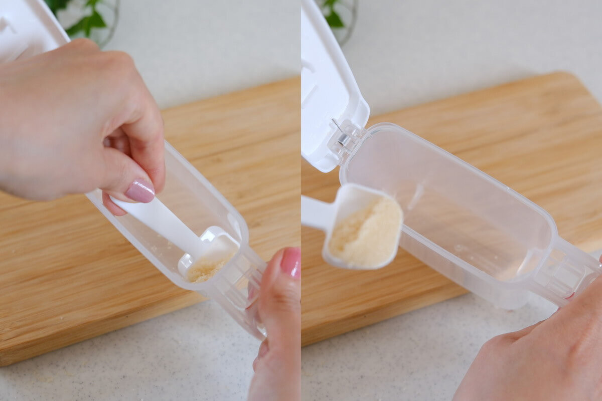 フタの部分ですり切りができるのも便利です。いちいちフタを下に置かなくて良いのも◎!