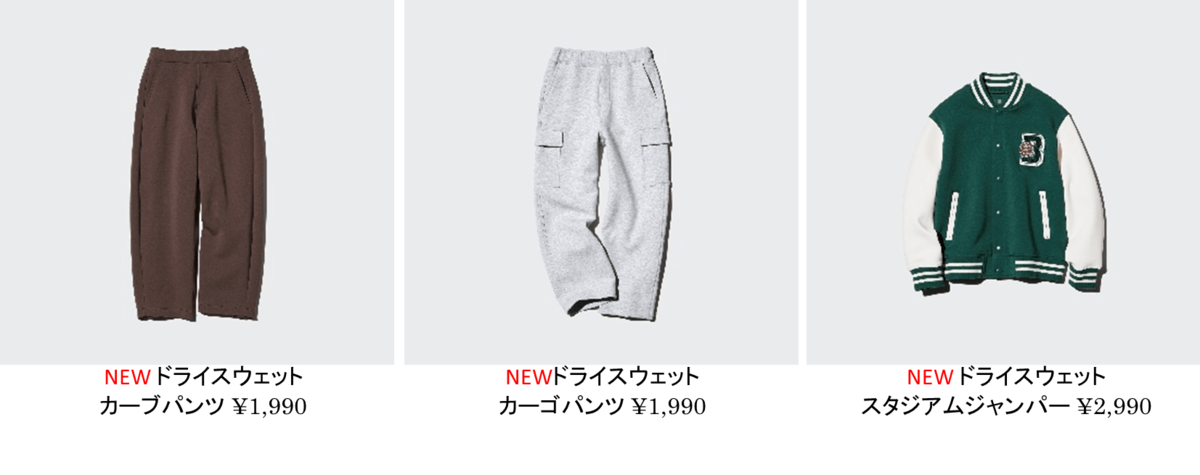 定番の「ドライスウェットパンツ」や「ドライスウェットフルジップジャケット」「ドライスウェットミニスコート」を継続して販売するほか、トレンドのシルエットを取り入れた新商品「ドライスウェットカーブパンツ」や「ドライスウェットカーゴパンツ」、「ドライスウェットスタジアムジャンパー」など、ベーシックとトレンドのデザインが豊富なバリエーションで展開されます。