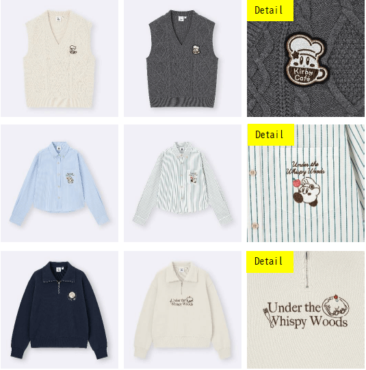 ウィメンズは、『カービィカフェ』のマークをデザインしたニットベストや、ウィスピーウッズのりんごを持ったカービィやワドルディの刺繍を施したストライプシャツのほか、デザートメニューをデザインしたハーフジップのスウェットが展開されます。