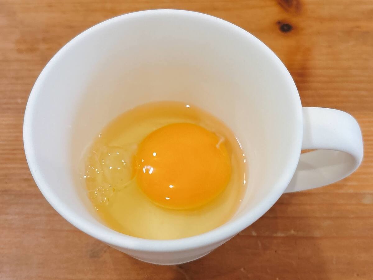 マグカップを用意し、そのなかに卵を1つ割り入れます。