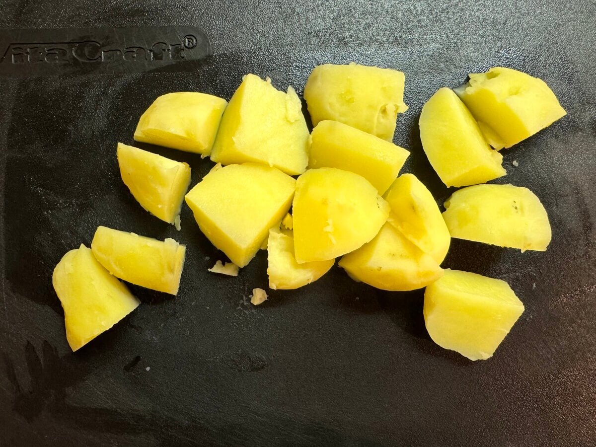 粗熱のとれたじゃがいもはラップを外して皮をむき、一口大の大きさに切りましょう。