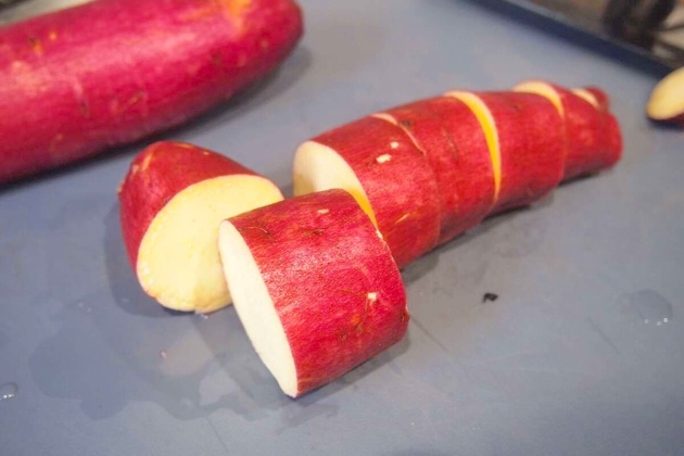 さつまいもは皮付きのままよく洗い、3cm厚さの輪切りにします。