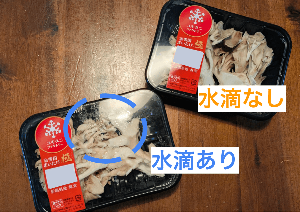 ▲編集部が行ったスーパーでは、同じ産地の舞茸でも水滴に差がありました