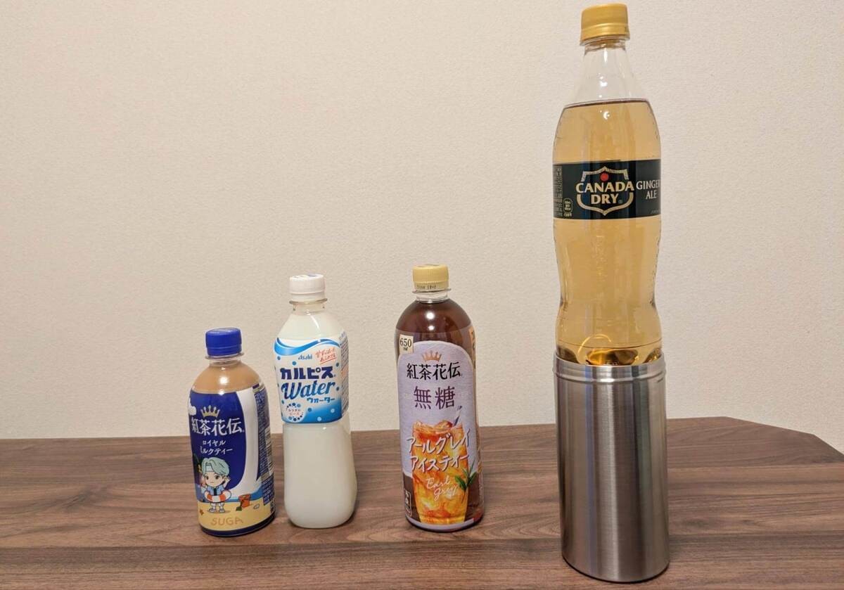 規定より小さいサイズや大きいサイズを入れたらどうなるだろうと好奇心が抑えられず、試しに左から440ml、500ml、650ml、700mlのペットボトルが入るか実験してみました。