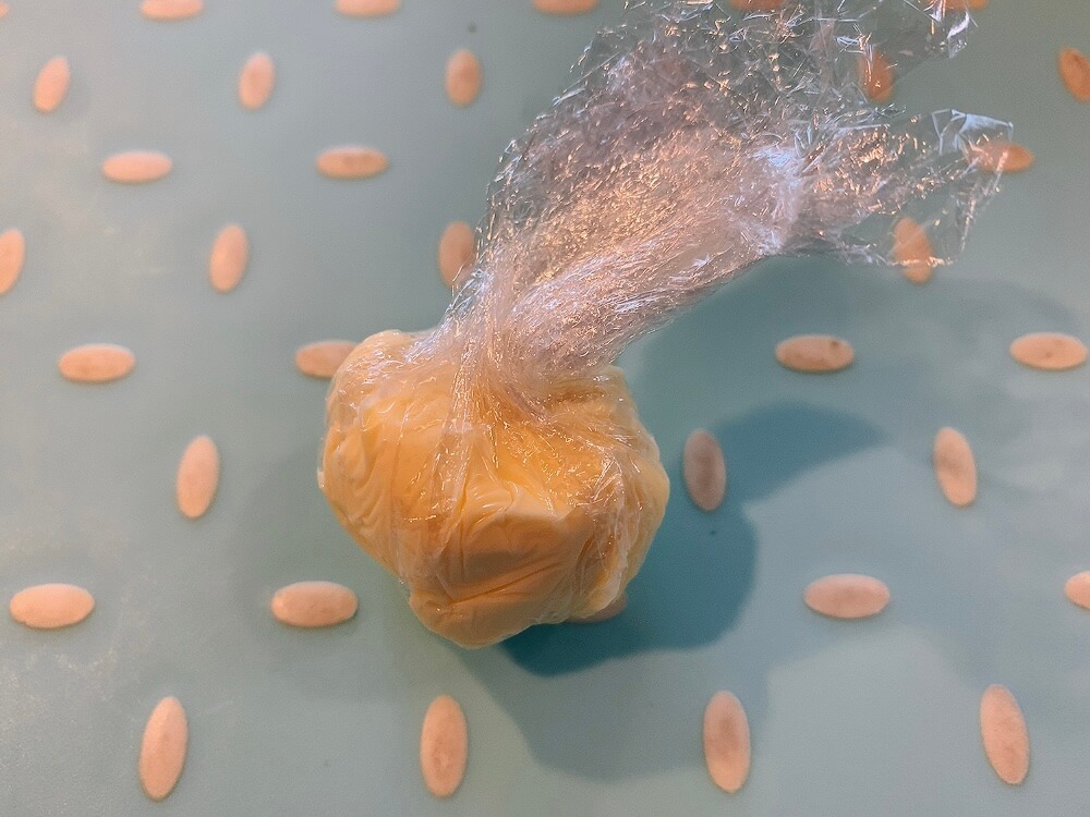 ラップの上にバターをのせたらそのまま包み、指で揉みながら溶かしていきましょう。マヨネーズぐらいの柔らかさが理想です。