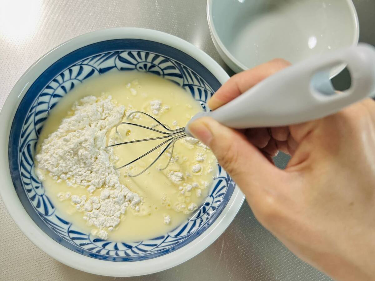 5分間が経過したら、泡立て器で軽く叩いて完全に溶かし、天ぷら衣は完成!