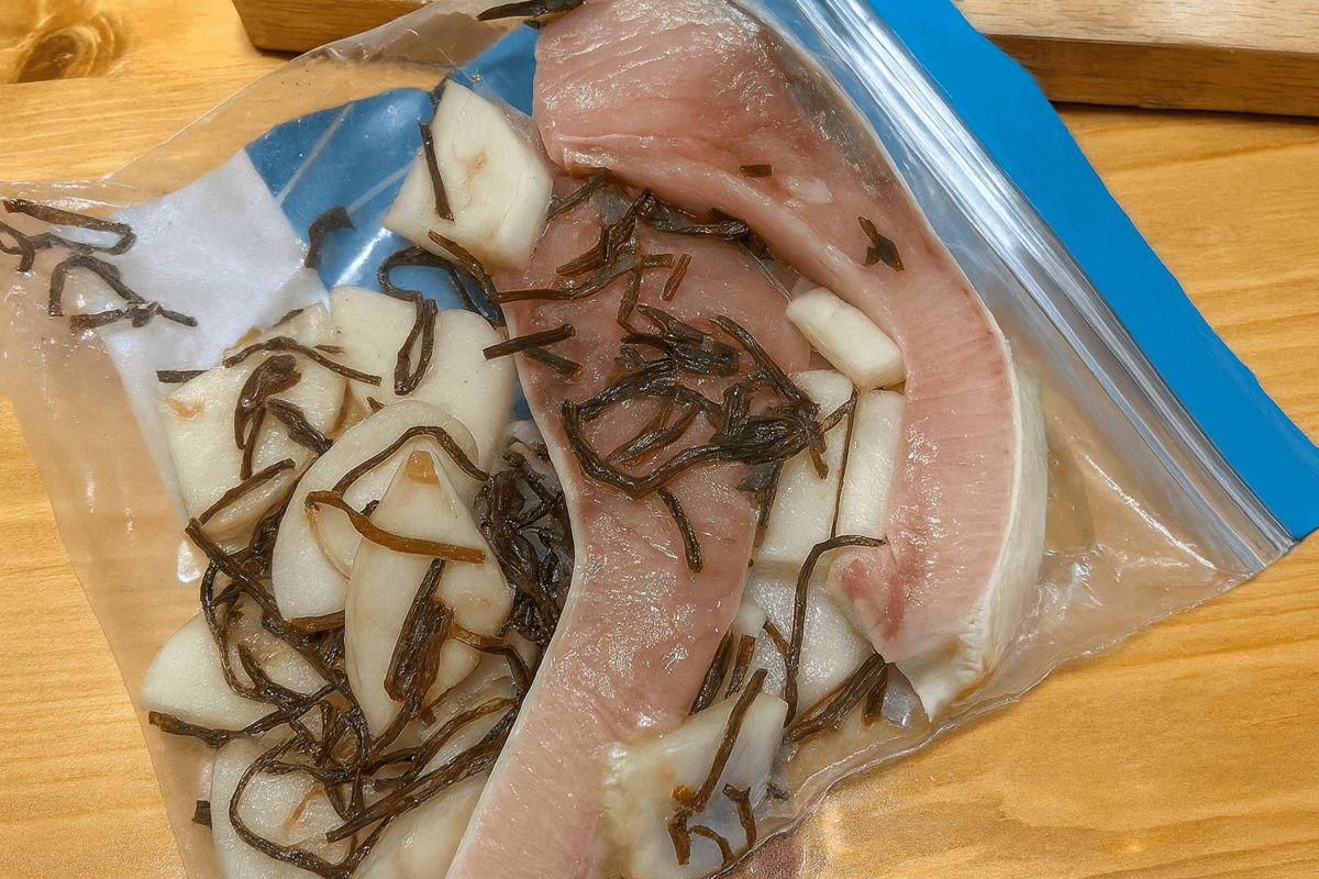 ブリの切り身と大根を①の保存袋に入れて、冷蔵庫で最低30分漬けておきましょう。