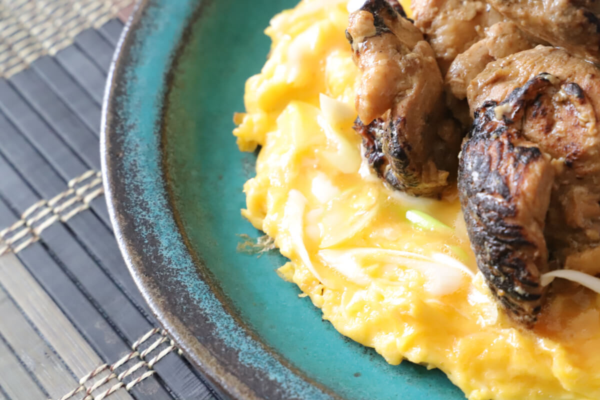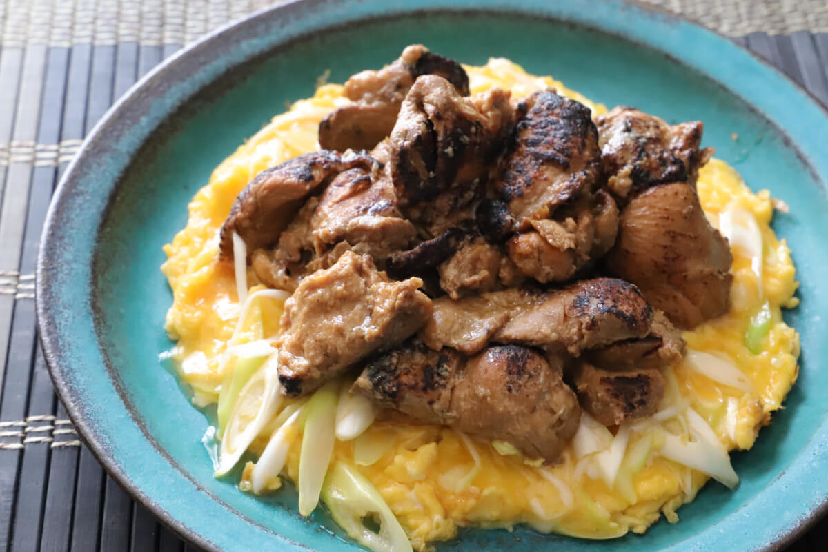 オムレツは、割りほぐした卵に、白だしとみりん、長ネギを斜め切りしたものを加えよく混ぜて、ふんわりと半熟状態に焼き上げました。白だしは風味づけ程度で十分です。 炭火焼きの風味がする鶏肉と、だしの効いた卵がとてもよく合いますよ。