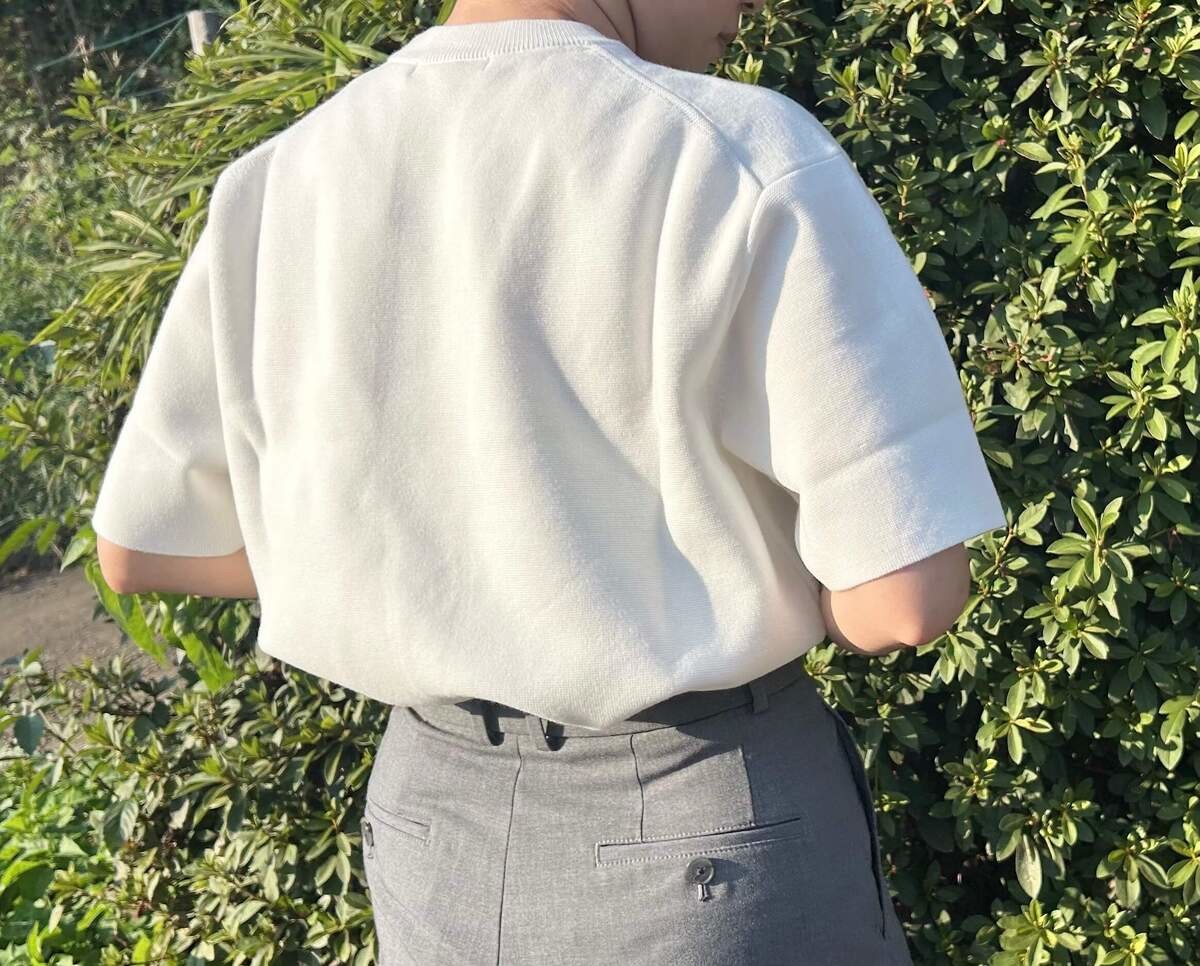 この夏は白Tシャツをよく着用していたのですが……「ウォッシャブルミラノリブセーター」にすることで、ちょっとスマートな雰囲気になりますね♪