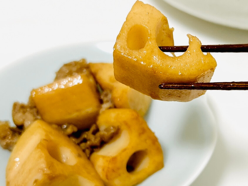 こっくりとした甘辛味のしみたれんこんは、歯応えが楽しい!シャキシャキ食感は食べ応えを感じさせてくれます。
