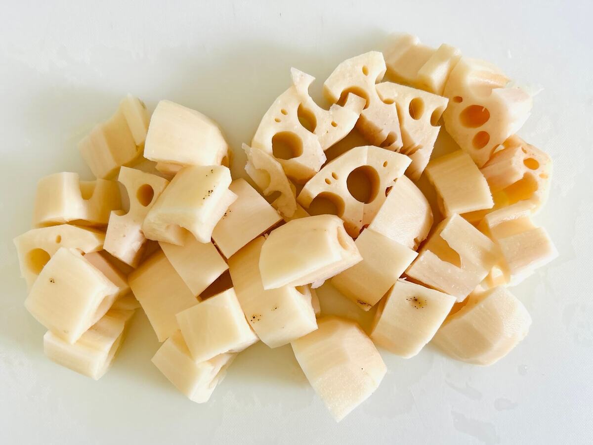 れんこんは皮をむき、3cm幅のいちょう切りにします。