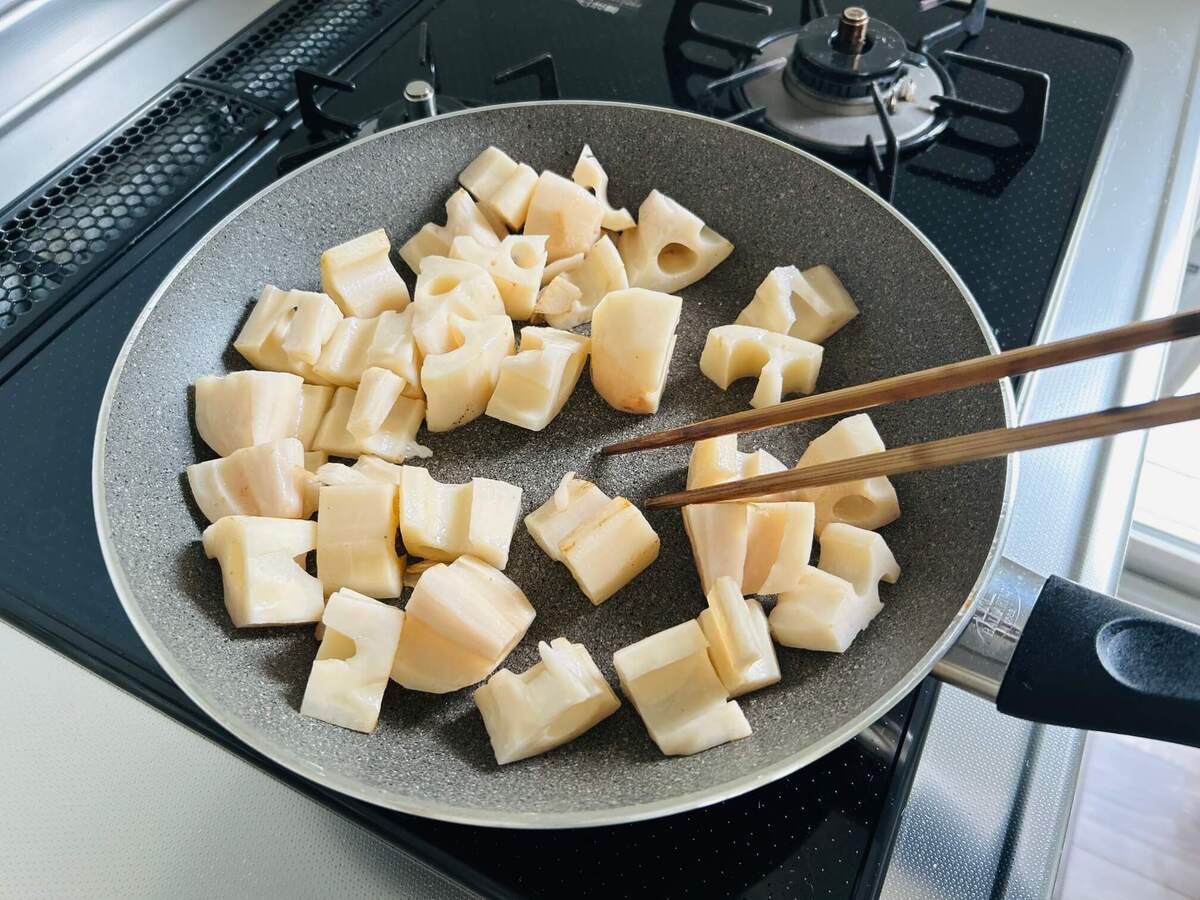 残りのサラダ油大さじ1/2を足し、れんこんを炒めます。
