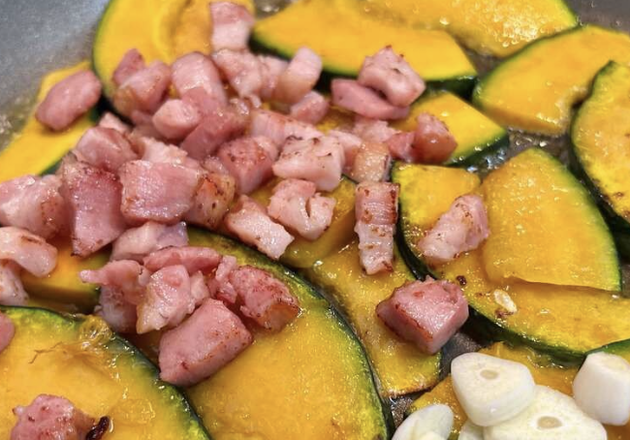 ベーコンを戻してにんにくを加えて、かぼちゃがやわらかくなるまで炒めましょう。ベーコンから出た油をかぼちゃに吸わせることで、味わいが良くなるんだとか。