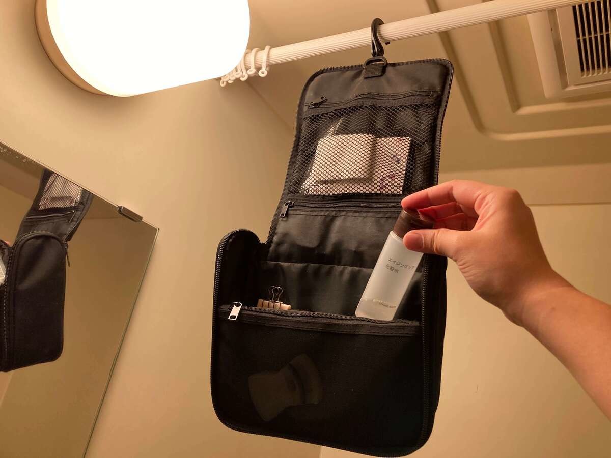 吊るしてすっきり収納。スキンケアとメイク道具をまとめて持ち運べるので、自宅同様に快適に使えます。