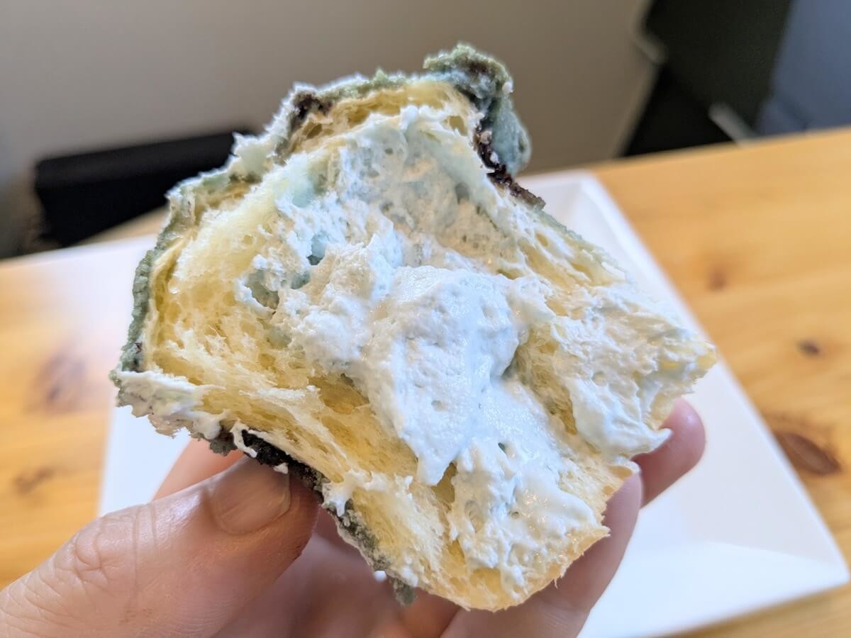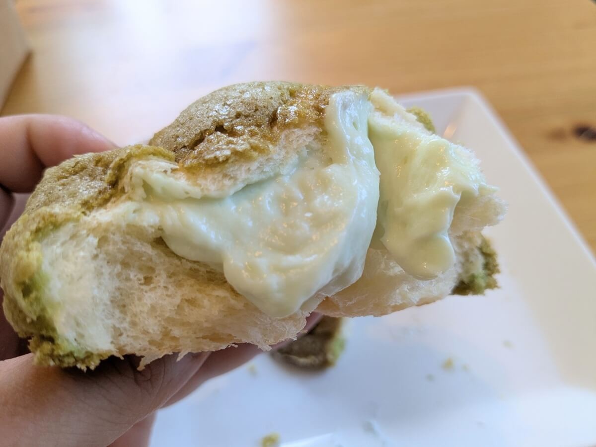 生地に茨城県産メロンのペーストが練り込まれ、中のクリームにもこれまた茨城県産のメロンクリームが使われているとあって、とにかく一口目からメロンのインパクトが強い。