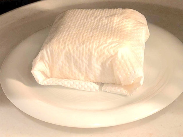 加熱後は、キッチンペーパーの中のお豆腐ちゃんがクツクツと音をたてているくらいホットなので、やけどをしないように注意して下さい。
