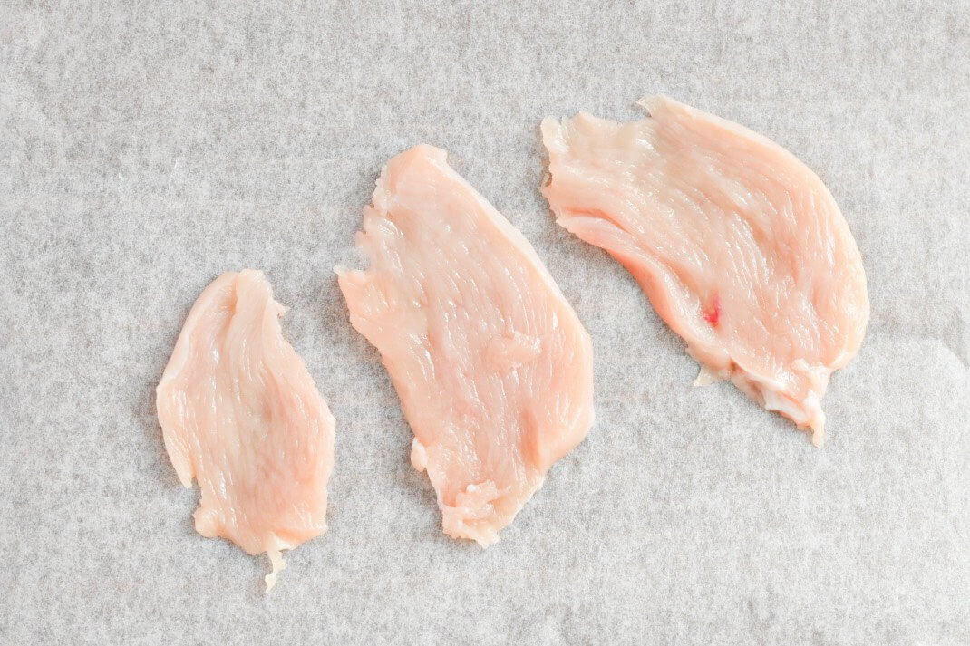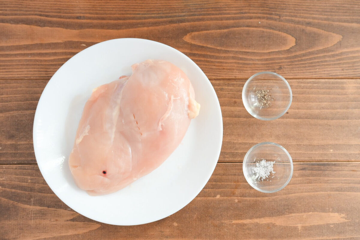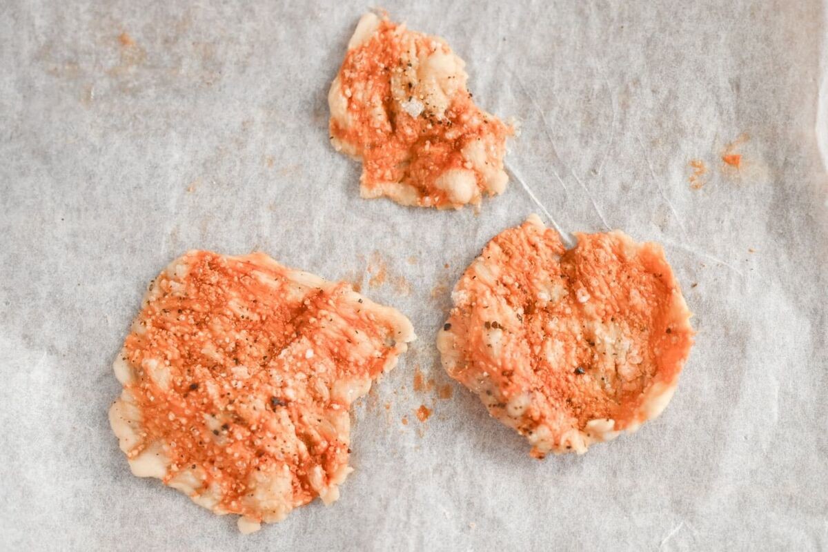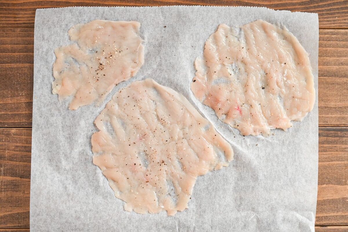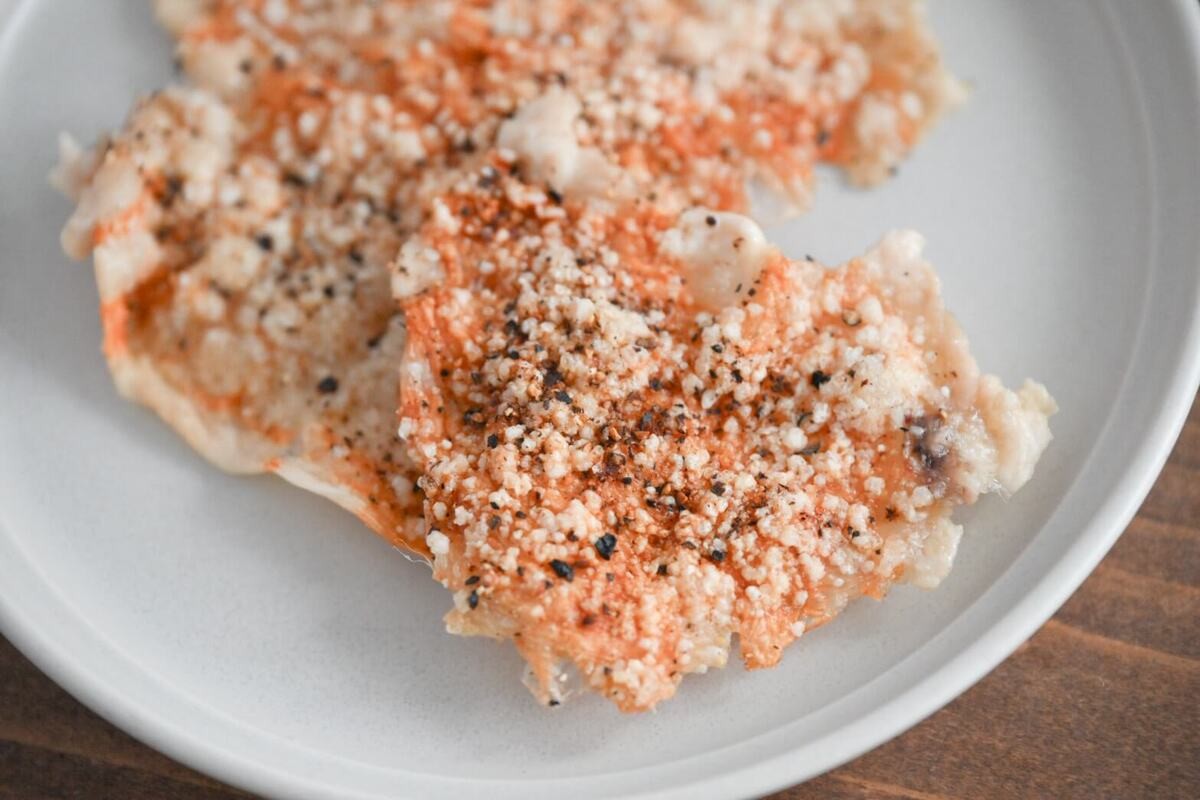チーズ味にする場合は、鶏むね肉を薄く叩き伸ばしたら、粉チーズと粗挽き黒こしょうをかけましょう。