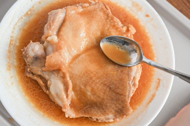 スプーンで皮目に汁をかけ、さらに電子レンジ(600W)で30秒加熱します。