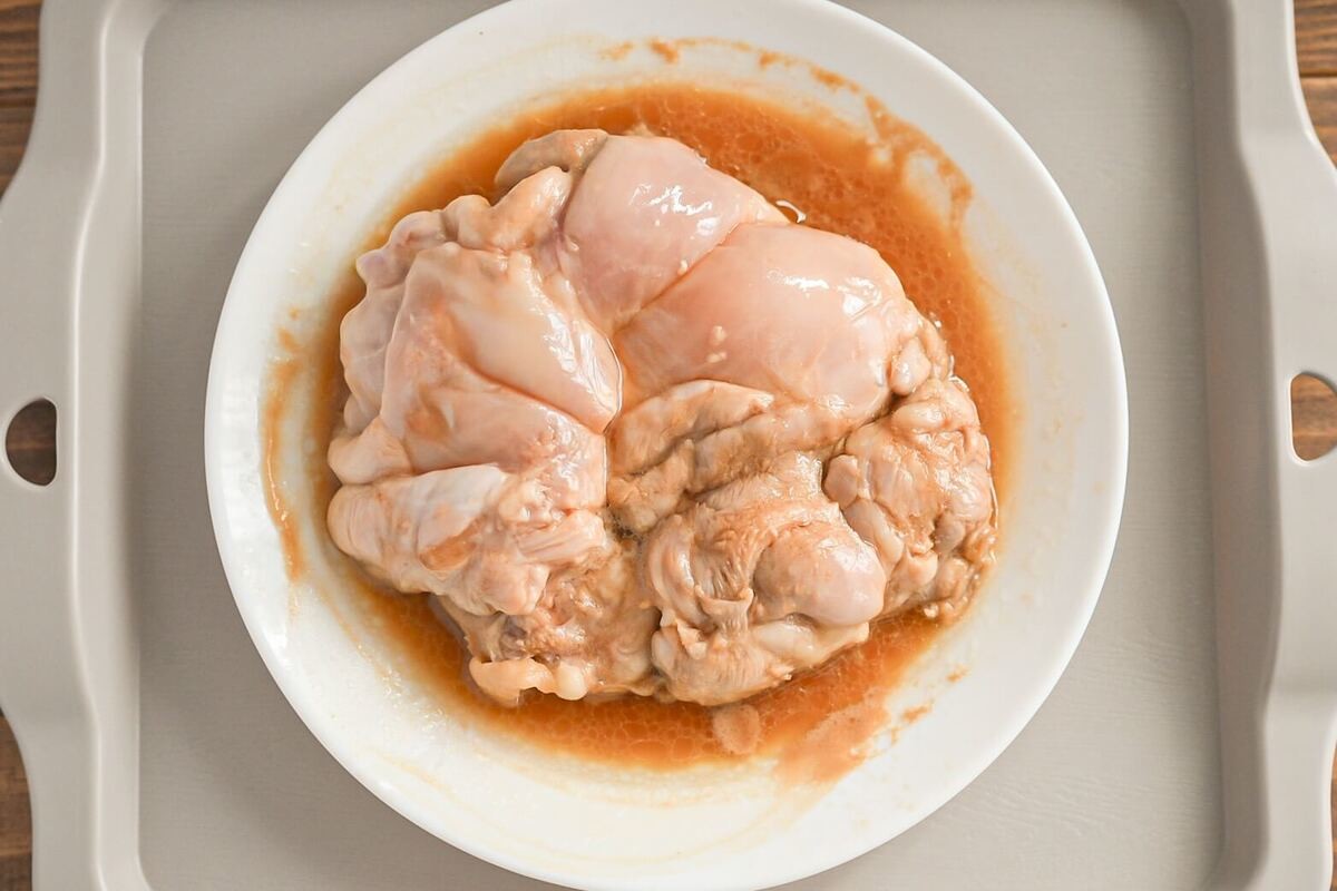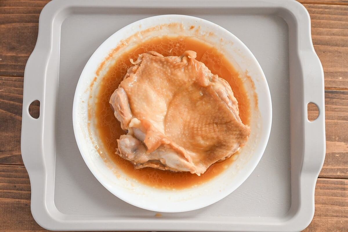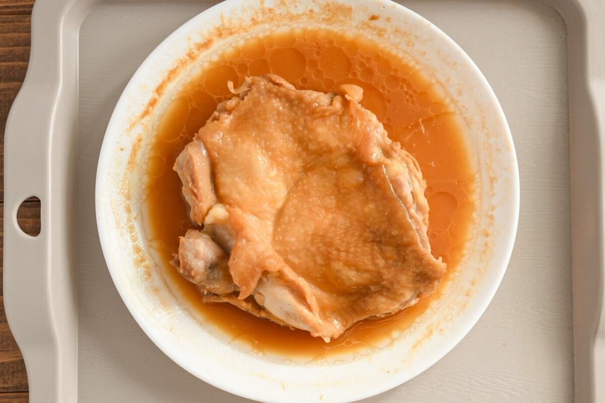 皮目を下にして鶏もも肉を耐熱容器にのせ、漬け汁も一緒に入れます。