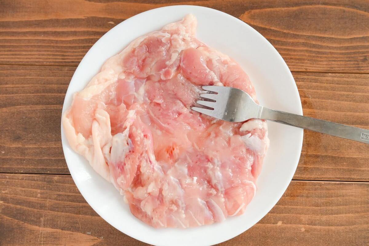 鶏もも肉の両面にフォークなどで穴をあけます。