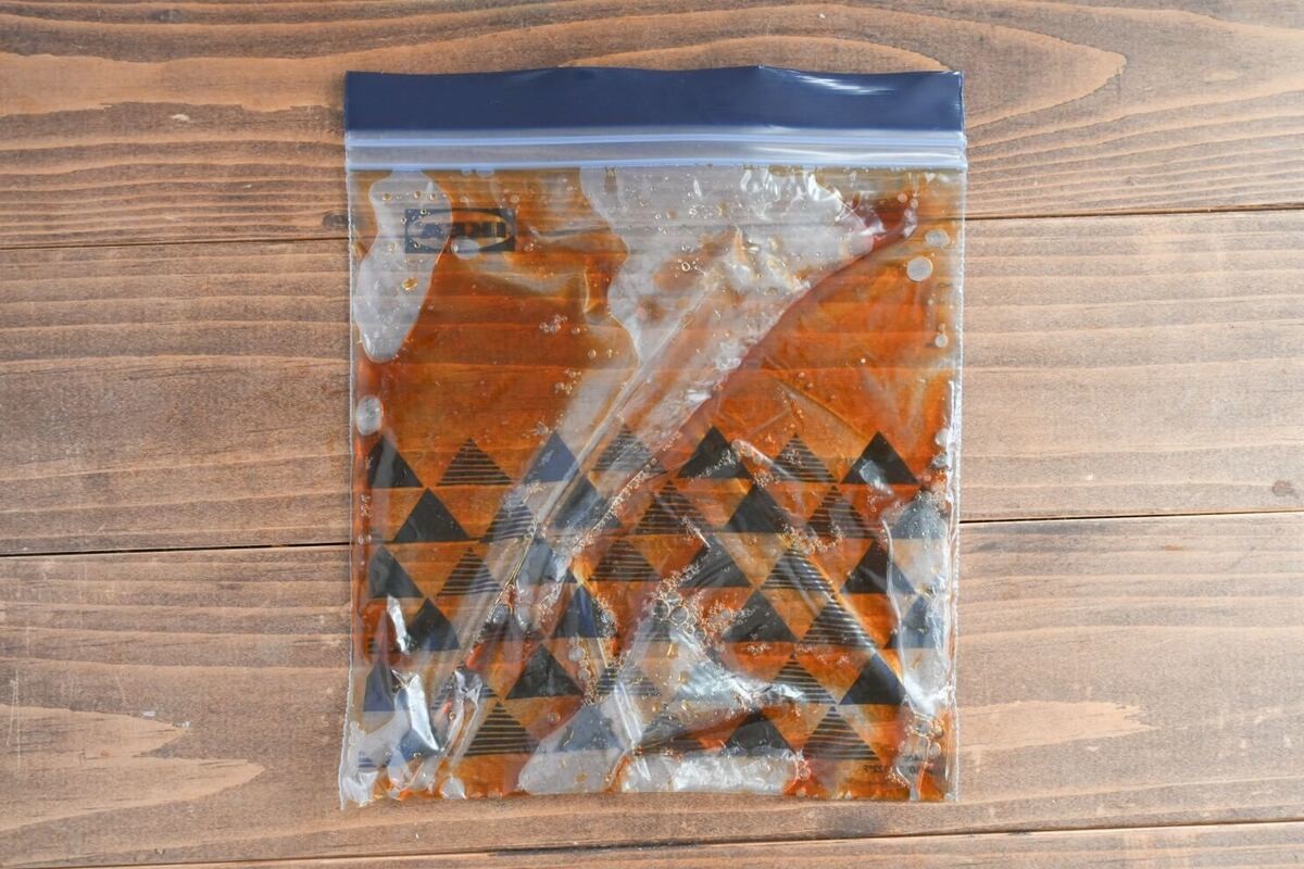密閉できる保存袋に、しょうゆ・みりん・はちみつ・レモン果汁を入れ、袋の上からよく混ぜます。
