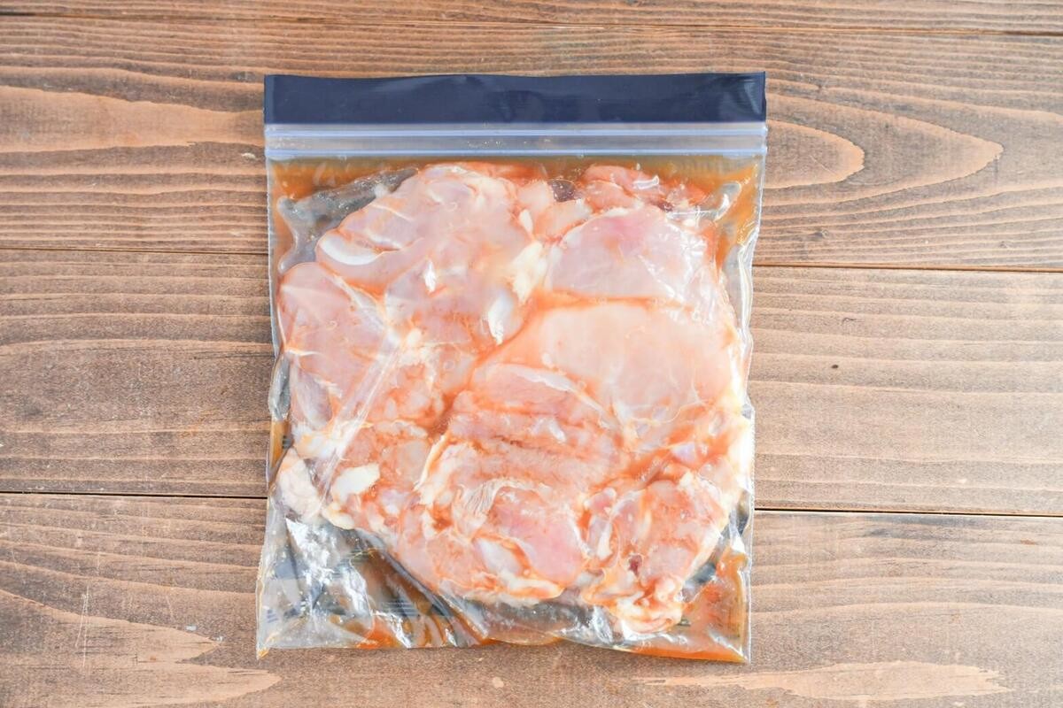 鶏もも肉を袋に入れ、ときどき返しながら約1時間漬け込みます。
