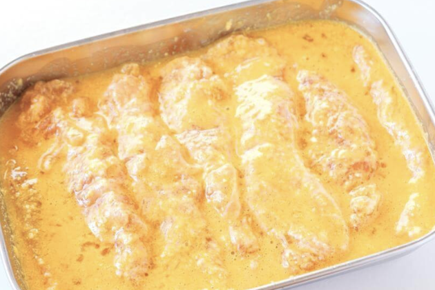 ささみに塩、こしょうをふり、小麦粉を薄くまぶして、混ぜ合わせた【A】にくぐらせる。