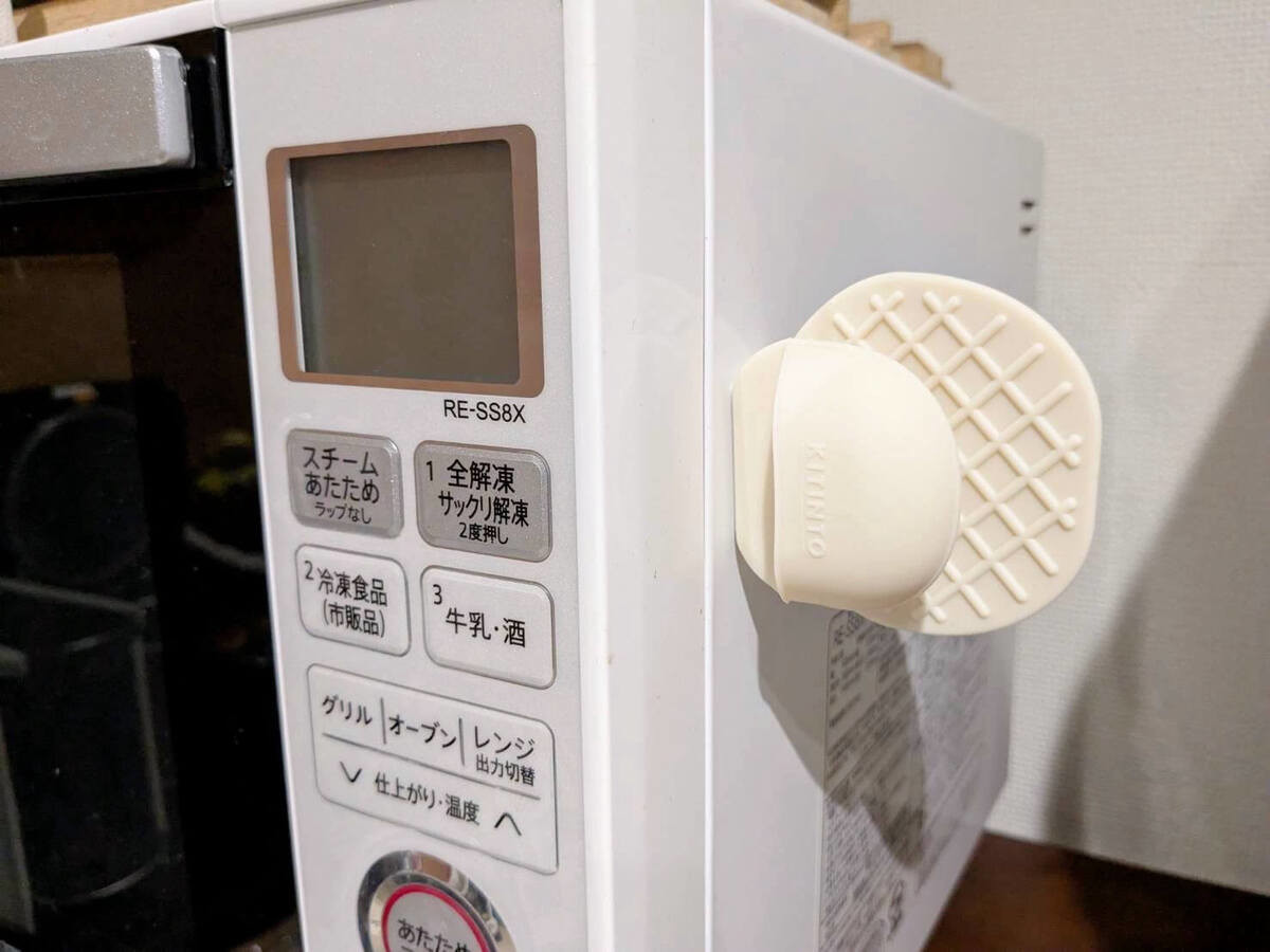 実はこの鍋つかみには磁石が内蔵されていて、使わないときは電子レンジや冷蔵庫にペタッと貼り付けておけます。