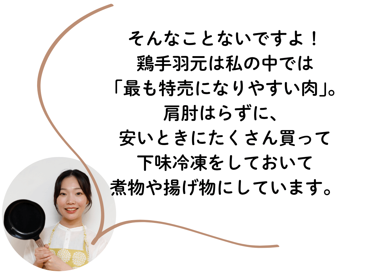 節約上手のりなてぃさん曰く、鶏手羽元は鶏もも肉や鶏むね肉ほど買う人がいないからか、「特売になっているのを最も見る」お得なお肉の部位!
